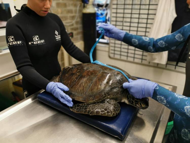 Upon arrival at the turtle rehabilitation facility at the Two Oceans Aquarium, the rehab team needed to remove some of Harry's shell plates, known as scutes, in order to remove infected tissues and clean his wounds. Harry initially showed great improvement, eating prawns from his carers and making regular use of the scratching post in his enclosure (something his carers loved to watch).