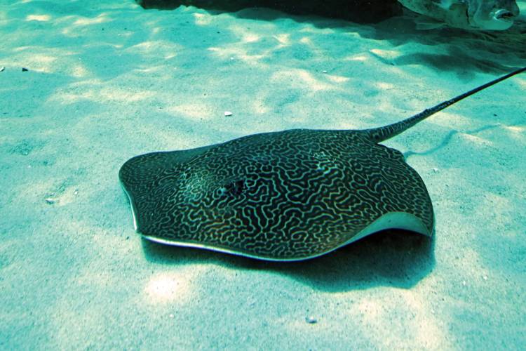 Although it's a predator, the honeycomb stingray is only adapted to hunting bottom-dwelling animals like crabs, mantis shrimps, mussels, octopuses, upside-down jellies and small fish.