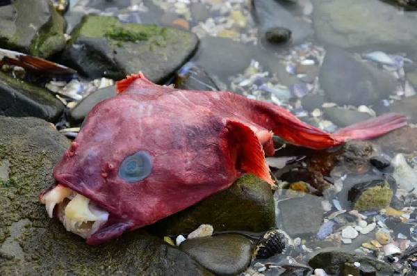 To make matters worse when it comes to the confusion surrounding the rocksucker, when they die and dehydrate on a beach, their combination of red skin, limpet-prying fang, and wide ribcage (to accommodate swallowing shellfish whole) lead many people to believe they have found the carcass of some sort of sea monster or dangerous animal.