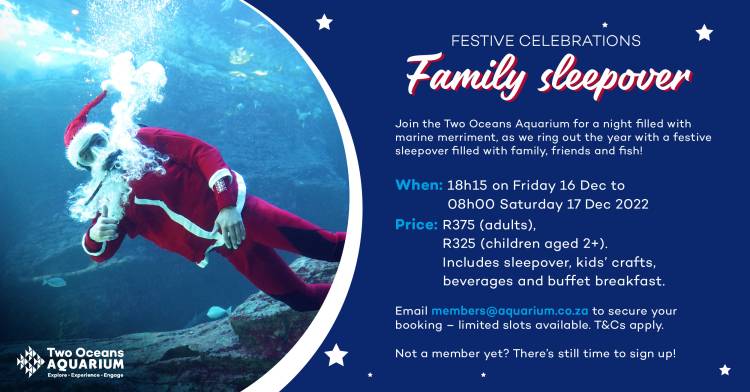 To book your spot at the Festive Family Sleepover, or to become a member, please contact our Members Centre on +27 (0)21 418 3823 or members@aquarium.co.za.