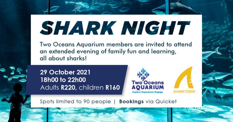 Members are invited to celebrate Sharktober at the Two Oceans Aquarium. We are hosting a special family night all about sharks on 29 October 2021, an exclusive chance for small groups to explore the Aquarium, learn more about sharks, and watch a family-friendly shark movie in a comfortable setting with some delicious treats added to the fun!