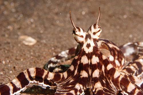 Although all octopuses can change colour and texture, and many can blend with the sea floor, appearing as rocks, the mimic octopus is the first octopus species ever observed to impersonate other animals. Sole fish, lion fish and sea snakes’ physical appearances are all aped by the mimic octopus.