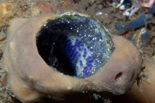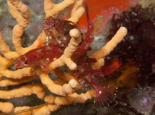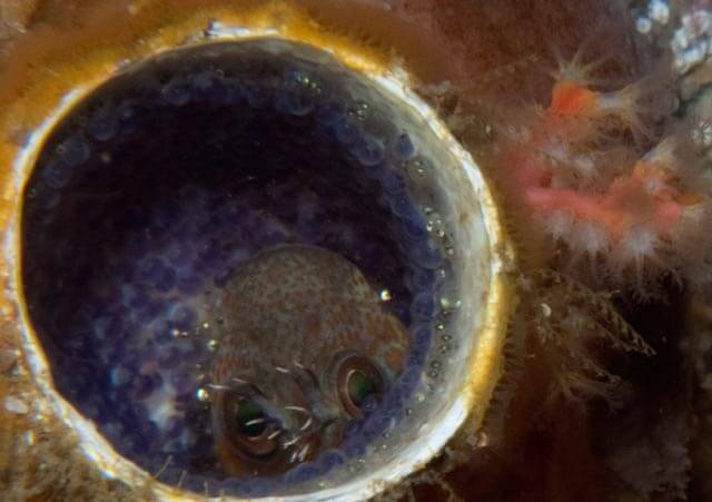 Two-eyed blennies lay their purple-yolked eggs in abandoned red fanworm tubes, and remain on guard in the tube while the eggs develop. The eggs are laid in batches so that there is a staggered hatching, possibly so that overall the chances of the larvae hatching at just the right time, temperature and sea conditions are spread over a period of time, rather than the brood all hatching at once and possibly right into the maw of a hungry beast.
