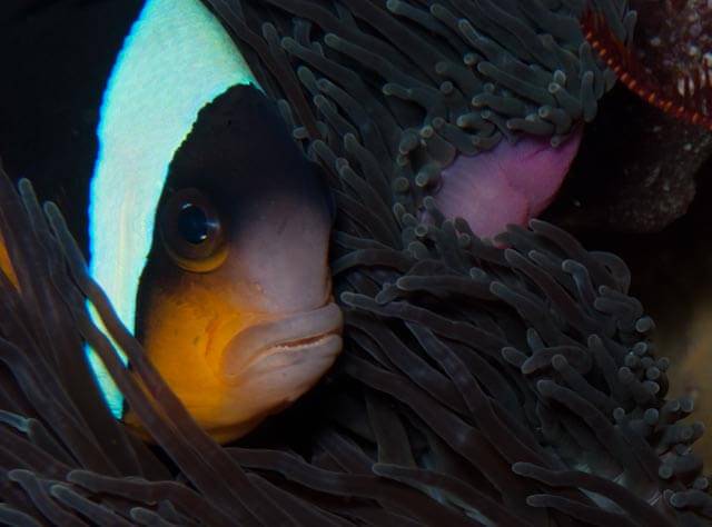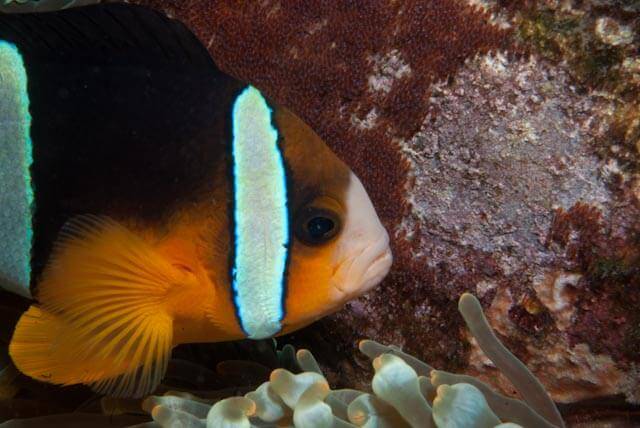 The twobar clownfish, a larger and darker version of the now-famous Nemo, lay their eggs on a hard surface near their home anemone. They then guard their eggs against predators on the lookout for an egg snack, as well as aerating them, until the tiny clownfish larvae hatch out.