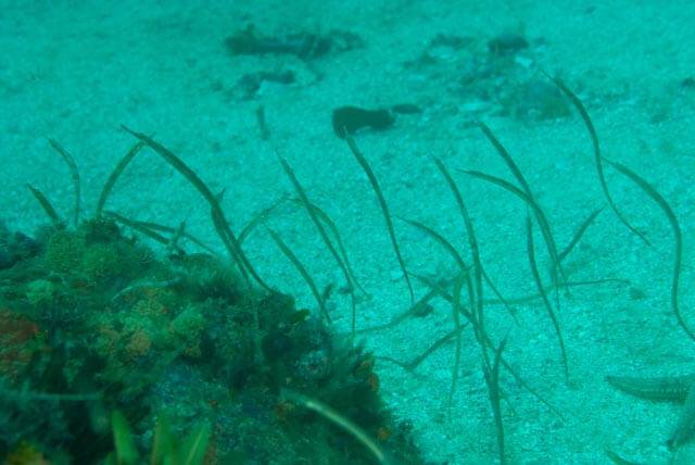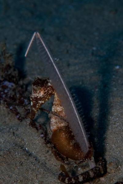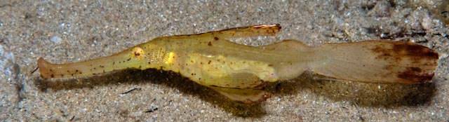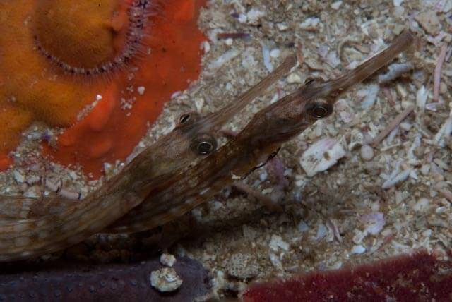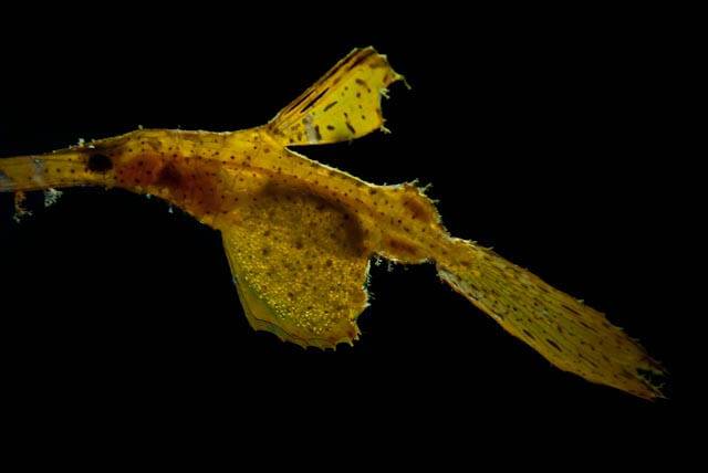 Ghost pipefish, despite looking very similar to both seahorses and pipefish, have a rather different way of looking after their broods. The females clasp their pectoral fins together to make a pouch and they will then swim with the developing eggs in their clasped fins, occasionally aerating the eggs, for as long as it takes for the babies to hatch.