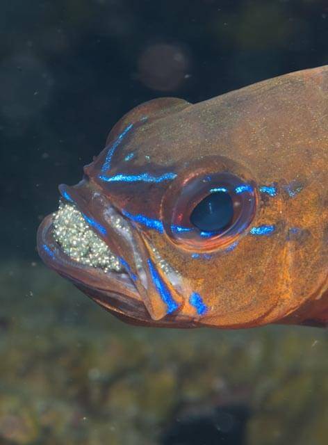Though they don't internally fertilise, cardinalfish are also committed parents, given that the males brood the eggs in their mouths, protecting and aerating them for as long as it takes for them to hatch. The female releases her batch of eggs near the male who then takes them into his mouth for brooding, periodically partially spitting the brood out and sucking it back to ensure the eggs are kept properly clean and aerated. Crucially, the father must starve for the duration of the brooding, although some observers suggest that at least some of the eggs are accidentally eaten.