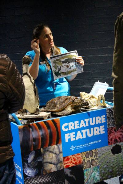 You never know where our Creature Feature will be stationed! Last night, our volunteers told the story of Bob the Turtle, who came to us very ill and who eventually pooped out a pile of balloons and plastic bags. Bob is one of the success stories of our turtle rehabilitation and release facility, and is well on his way to recovery and can be seen in the I&J Ocean Exhibit.