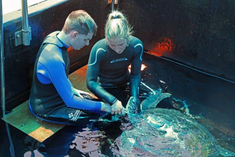 Bob is a green turtle, who I am told experiences blindness, but fortunately is starting to see visually in one of his eyes again. Sandy is a female green turtle who is recovering from a horrible experience at the Breede River mouth where a boat's propeller blade cut into her carapace.
