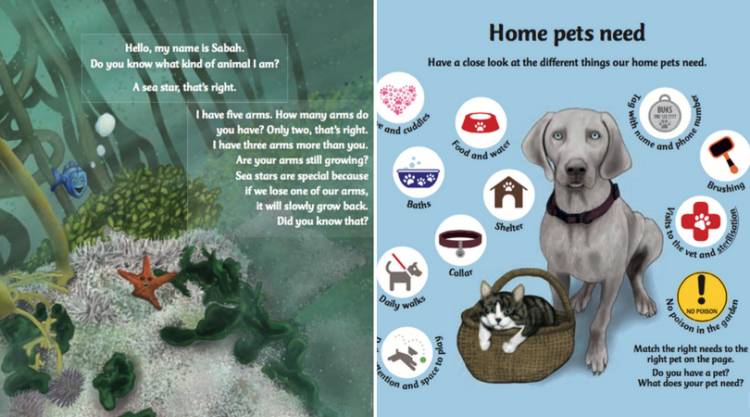The fun, colourful book is filled with extra activities, such as “Brain Tickles”, vocabulary games, basic biology facts about sea stars and lessons about how we should take care of our pets.