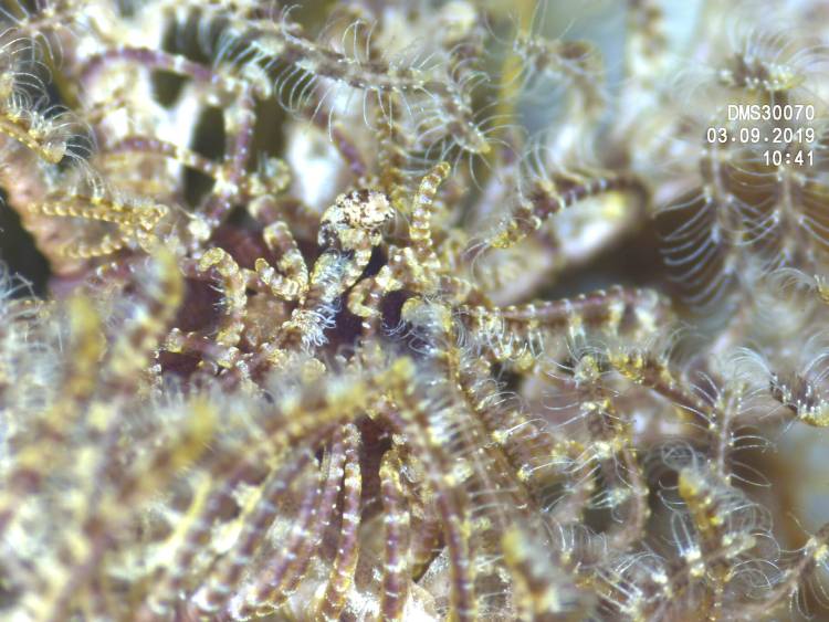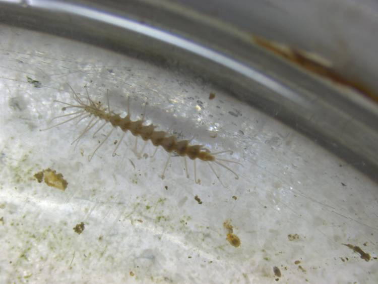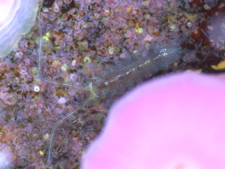 On the small scale, plenty of tiny animals become revealed, like this tiny marine isopod. These underwater scavengers are close relatives of the woodlice we see on land.