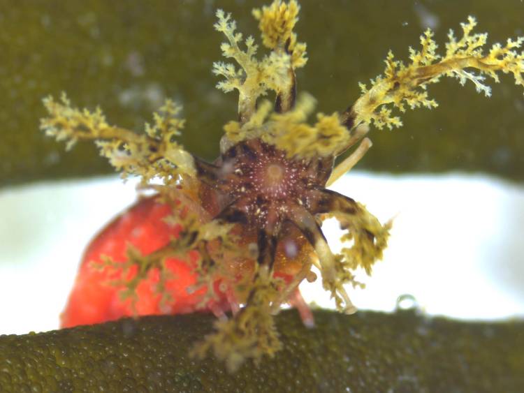 Taking a closer look, you can see the urchin's "nippers". These small, pincer-like feet are used to grip objects. In the case of the Cape sea urchin, these objects are held up as sun shields and camouflage.