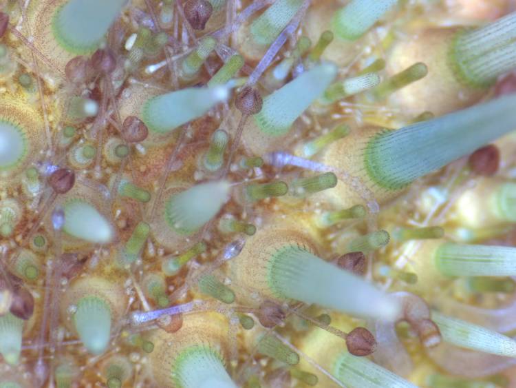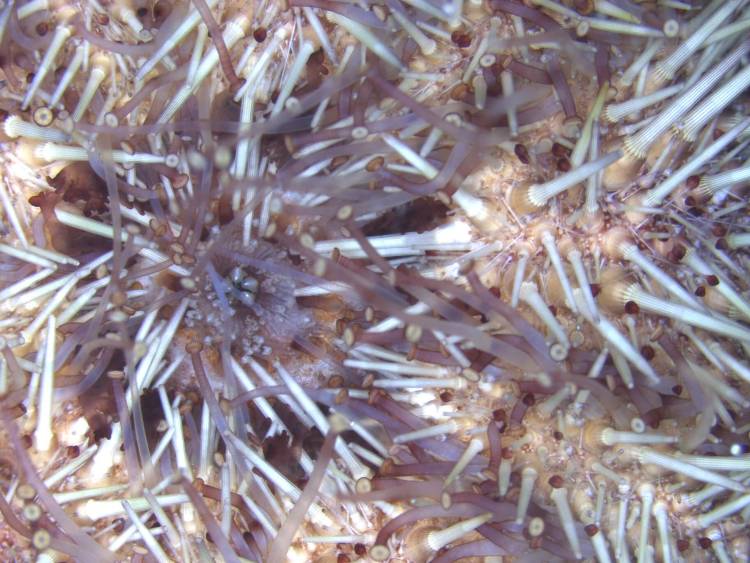 A close up look between the spines of a Cape sea urchin. What looks like a simple animal is, in fact, very complex - can you spot its spines, tube feet, nippers and photosensitive cells?