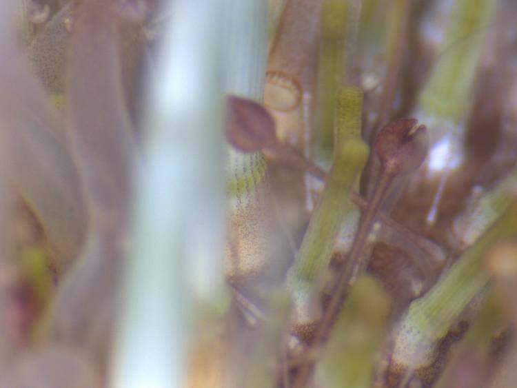 This is a microscopic polyp - it could be a coral, a young anemone or even the juvenile stage of a jellyfish. All animals in the phylum Cnidaria begin life as a tiny polyp like this.