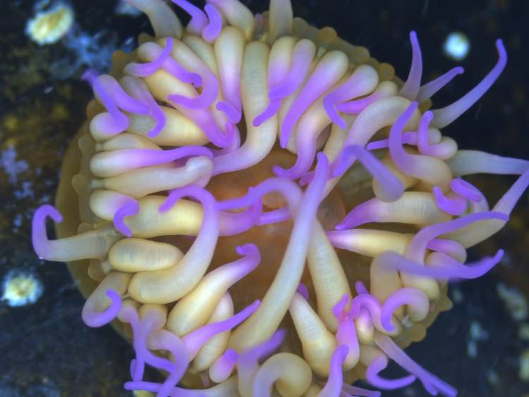 These strawberry anemones look just like ordinary anemones, but are actually more closely related to corals. "Corallimorphs", in general, resemble large stony corals, but in some species, like our local strawberry anemones, the individual polyps that would have made up the coral are large enough to survive on their own.