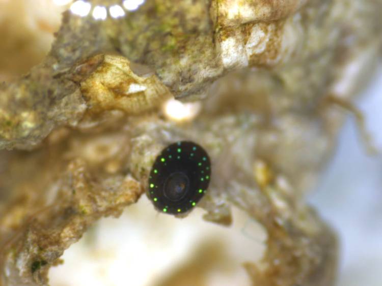 A tiny Cape keyhole limpet, the size of a grain of sand. As it grows, the green and black colours will be replaced by bands of red and brown.