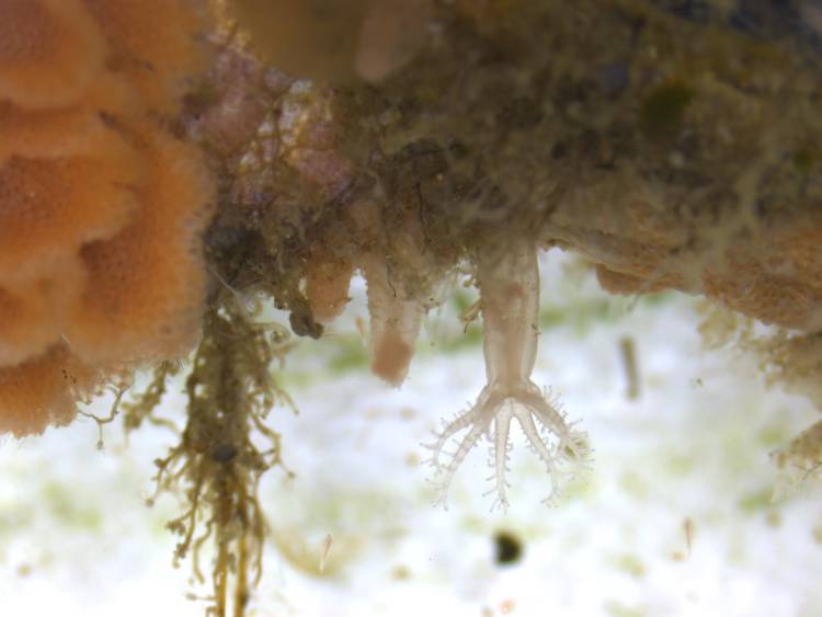 Behind the tentacles of this polyp lies a tiny hydroid, a little-known, yet common, marine animal closely related to anemones and jellyfish.