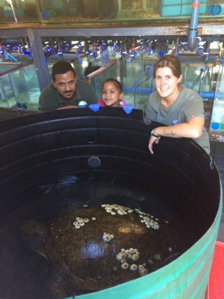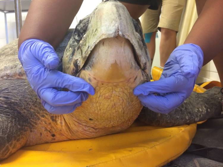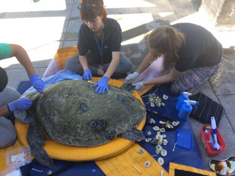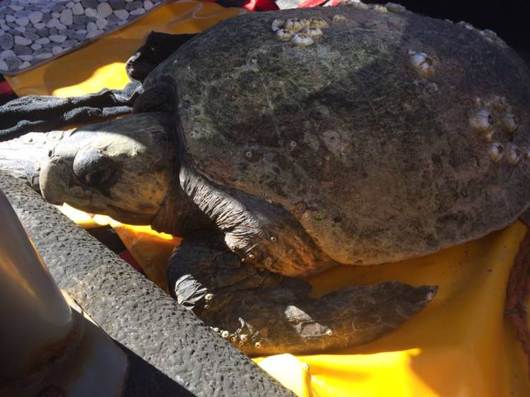 Upon arrival, our newest patient was taken up to the veterinary clinic and examined. Her carapace was given a good clean, but was covered in large barnacles that would take time to remove. No major external injuries were found, but the presence of the barnacles indicated that she had been floating for quite some time.