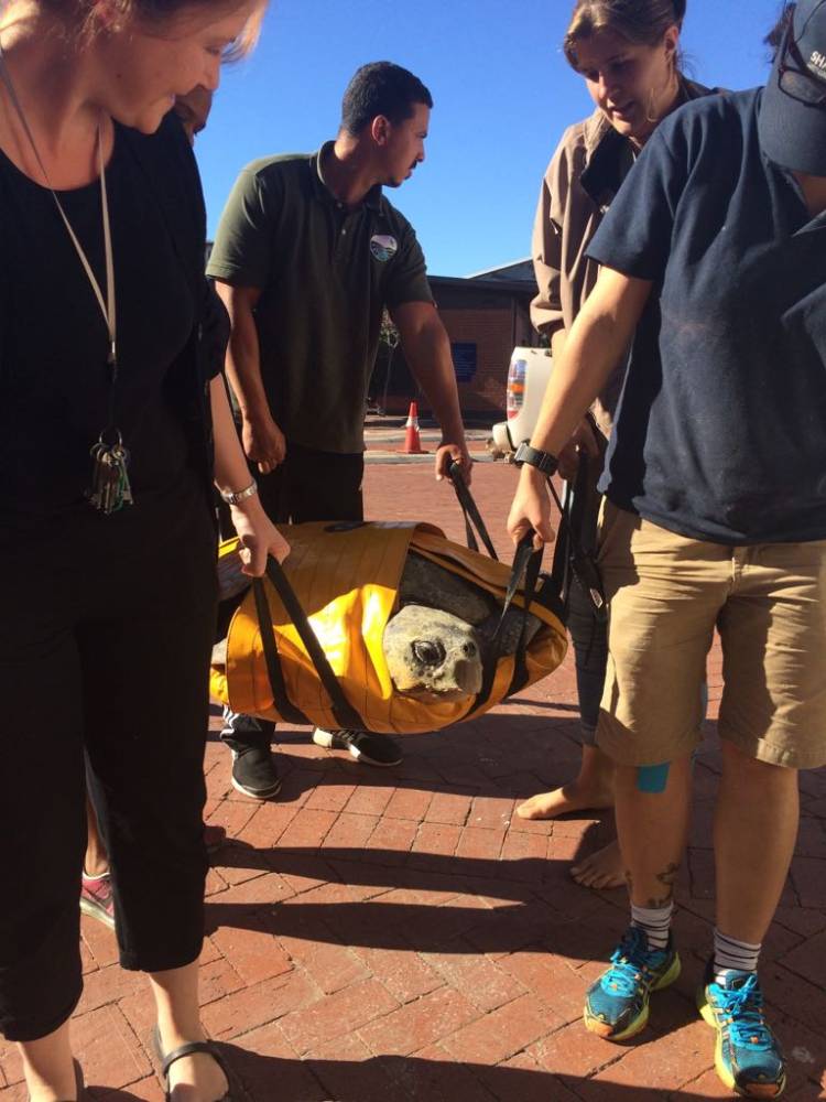 Like the isiXhosa name Nocawe suggests, the Two Oceans Aquarium turtle rehab centre received this giant newcomer on a contented and warm Sunday afternoon, 29 April 2018. Noci, as those who are affectionate with her like to call her, is a loggerhead turtle (Caretta caretta), weighing 64.7kg (big, but still only a third the size Yoshi was when she was released), who washed up on a beach near Witsand. Rescuing a turtle is a team effort and this was no exception.