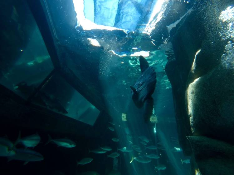 When you come around to visit the sunfish, take note of its beautiful mottled skin patterns. You’ll also love its beaked mouth, like a parrot’s, and the way it looks paper-thin when viewed from directly in front or behind.