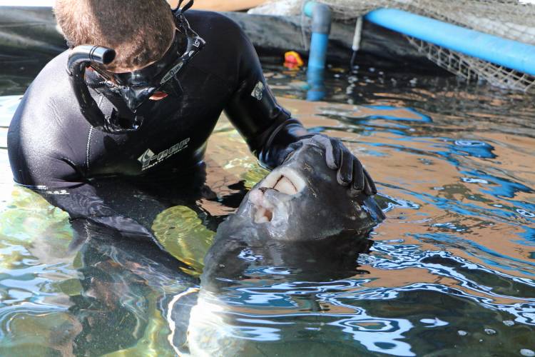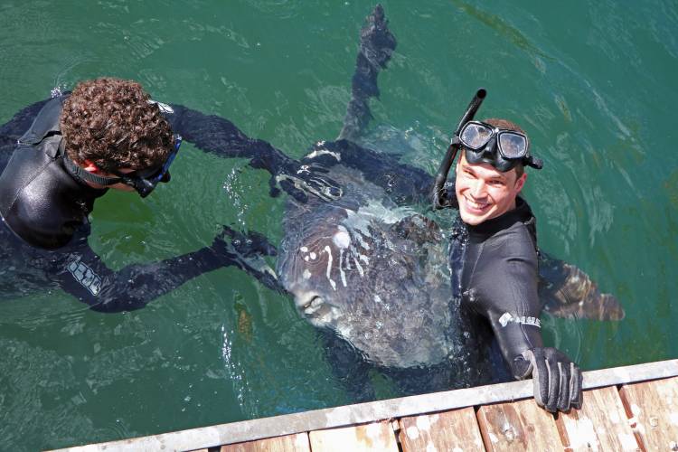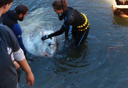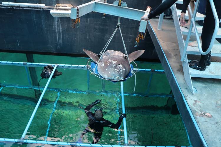 The sunfish was covered in two types of parasites, which were painstakingly removed by hand, with tweezers, before the sunfish was gently lowered into the enclosure.