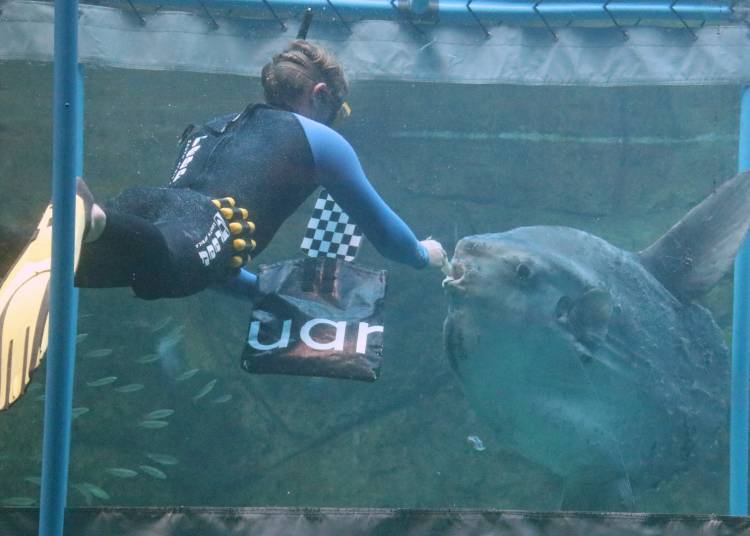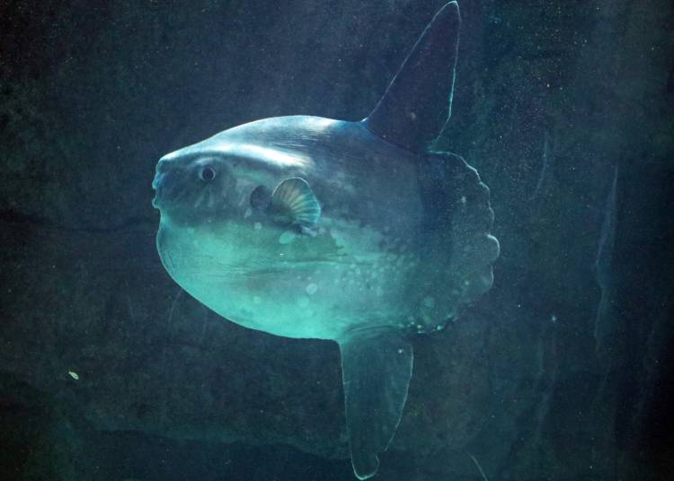When you come around to visit the sunfish, take note of its beautiful mottled skin patterns. You’ll also love its beaked mouth, like a parrot’s, and the way it looks paper-thin when viewed from directly in front or behind.