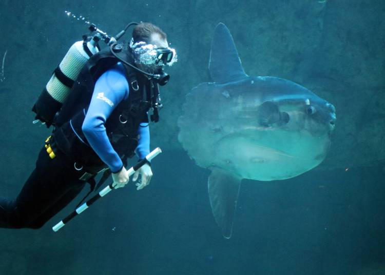 We removed the sunfish's temporary enclosure from the Predator Exhibit this morning and the sunfish is now swimming around the exhibit. We sent some divers in to help it around the tank and to closely monitor the sunfish's interactions with the other animals in the exhibit.