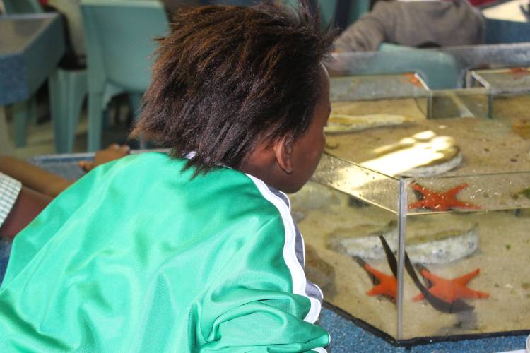 The eager group was taught the difference between the Atlantic and Indian Oceans, why water temperatures and marine life differ in each, and the importance of conserving our oceans as vital life-support systems. They held prickly sea urchins, large orange starfish and slippery pieces of kelp. Mr Lembeni taught enthusiastically in the learners’ first language of isiXhosa, explaining what an eco-system is, what makes up a rocky shore, and what each person can do to sustain their precious marine resources.
