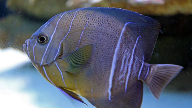 The old woman angelfish (Pomacanthus rhomboides) is a very large angelfish, growing up to 45cm long. It is usually a dull brown colour with faded blue, white or grey stripes.