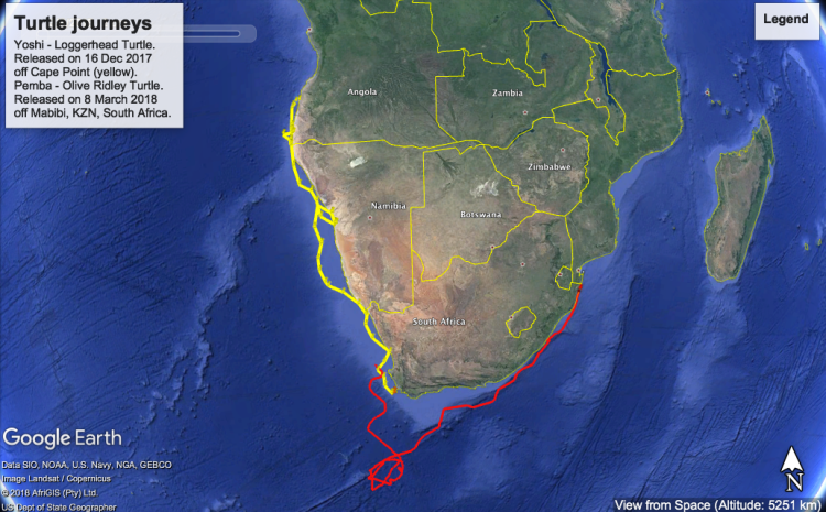 This story begins more than five months ago, with the release of the Two Oceans Aquarium's famous giant loggerhead turtle back into the Atlantic Ocean. But, those of you who have been following Yoshi's journey might be surprised to know that you are not the only ones following her 4000km journey - Pemba, the olive ridley turtle jointly released by us and uShaka Sea World in KwaZulu-Natal - has picked up Yoshi's trail!