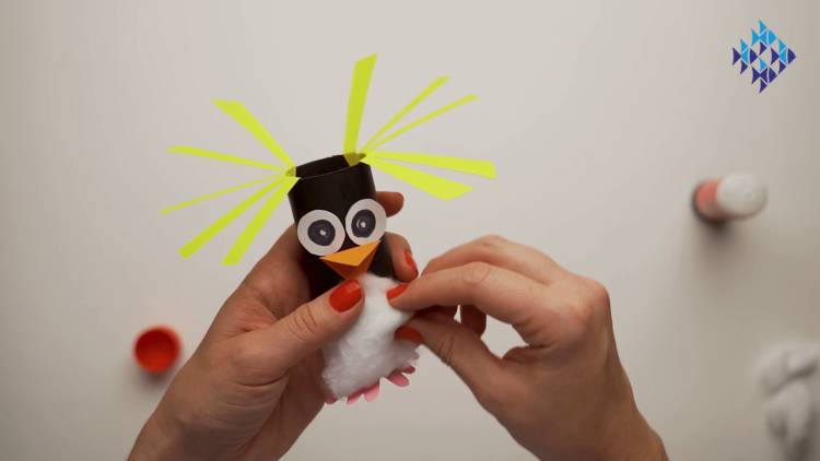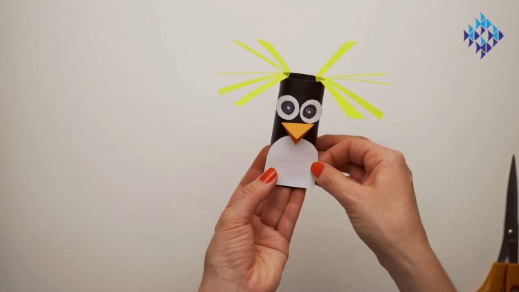 - Glue the yellow wedges into the top of the toilet roll - give those crests a bend or two to add some character to your penguin.