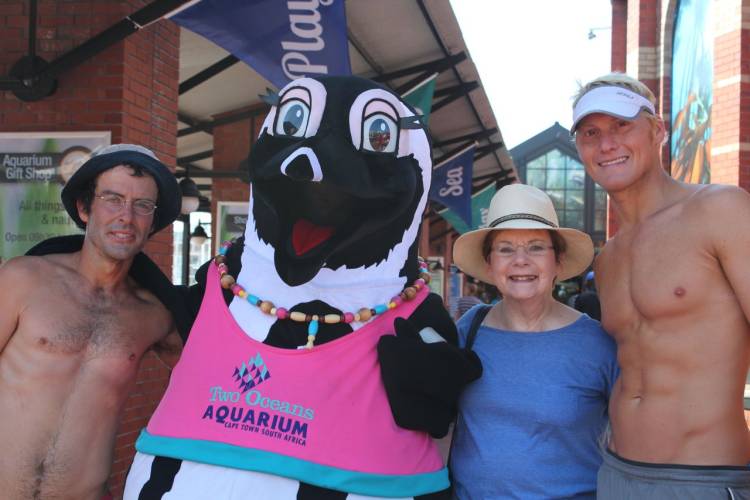 The Two Oceans Aquarium has championed the cause of the African penguin many times before, through our Waddle For A Week campaigns, as well as our conservation programme. So when Dave made his way through Cape Town, we invited him to come and meet some of our resident penguins and chat about his run, dubbed The Penguin Plod. Ana-Alicia Marais, penguin assistant at the Two Oceans Aquarium, and Samantha, our African penguin mascot, welcomed the visitors and showed them around the Sappi River Meander.