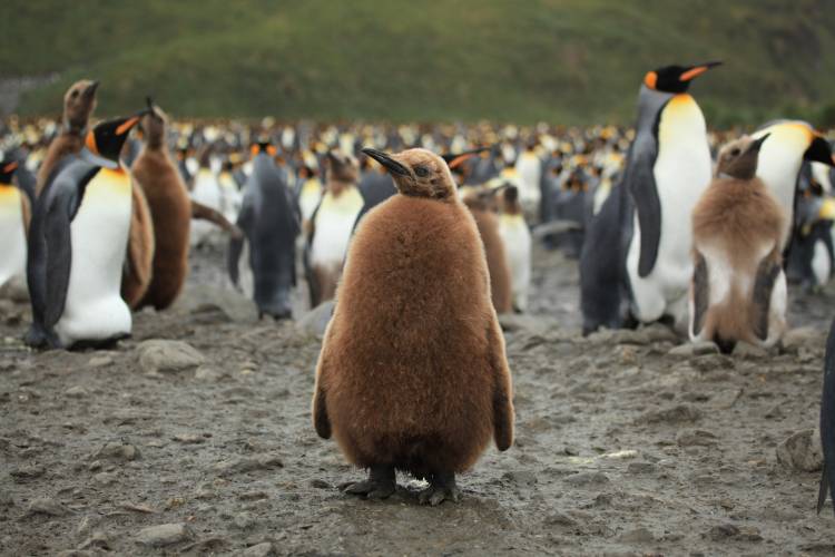 King penguins (Aptenodytes patagonicus) are the second-largest penguin species and the second most common on Marion Island. They do not have permanent colonies - instead, they spend most of their lives at sea, journeying up to 1 600km away in pursuit of lanternfish and squid. These penguins are stunningly beautiful, but their fuzzy brown chicks may just be the ugly ducklings of all penguins.