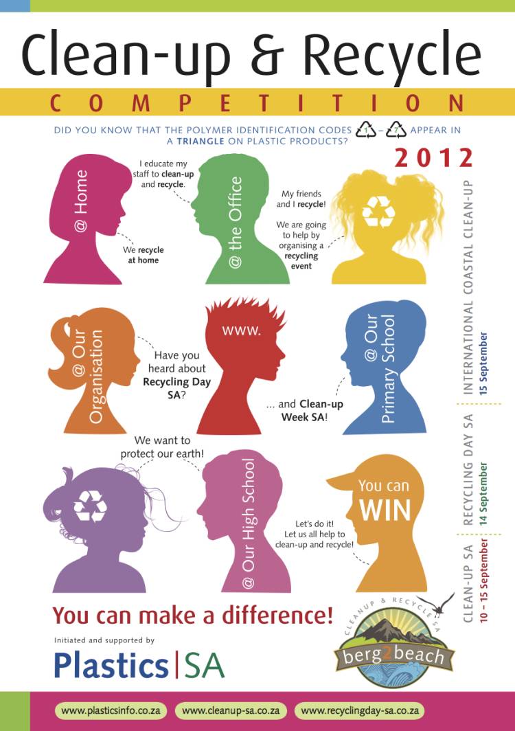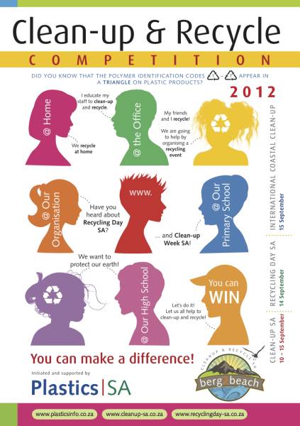To find out more about plastic recycling, identification and clean-ups, visit the various Plastics|SA websites (www.plasticsinfo.co.za; www.cleanup-sa.co.za; www.recyclingday-sa.co.za), where entry forms, rules of the competition and more information can be downloaded.