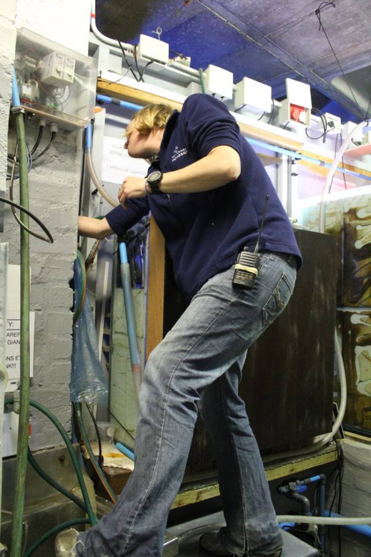 In the morning it’s a mad rush from 07h00 to 09h30 because we have to clean all exhibits before the public starts arriving. This involves ladders, buckets, scrubbing, siphoning … We prepare the tanks so they look their best.
