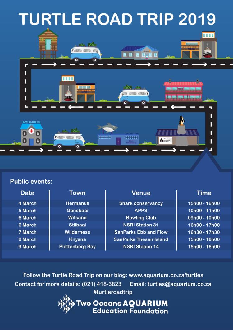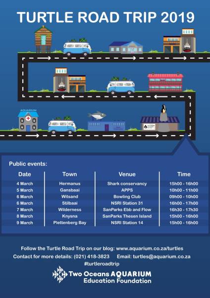 From 4 to 9 March 2019, the Two Oceans Aquarium's environmental outreach educators and Turtle Rescue Programme team will be travelling between the coastal communities of the Southern Cape to educate a new generation of turtle rescuers for the upcoming stranding season. This Turtle Road Trip will be stopping at seven network points where members of the public are invited to meet the conservation team, and learn how they can save a turtle - after all, it won't be a veterinarian who stumbles across a stranded animal, it will be someone just like you.