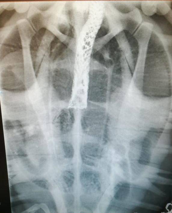 Suspecting a possible lung infection or pneumonia, we started with antibiotics and supportive medication. Over the next couple of days, we noticed that the turtle was becoming weaker. Five days after its arrival, a barium study was done to investigate if the turtle possibly had a blockage. A Barium study takes place over a couple of days, and when X-rayed four days later, we found that the Barium had not moved as one would expect. We were able to confirm that the turtle indeed had some kind of obstruction in its oesophagus.