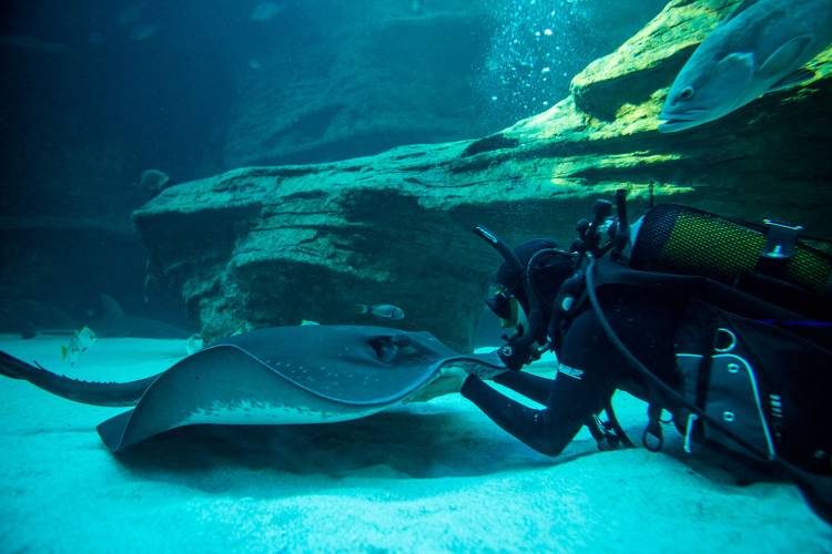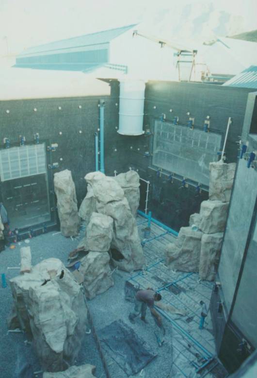 In the early days of the Aquarium’s construction back in 1994/1995 large artificial rocks made of fibreglass were created from moulds of real rocks to ensure the authenticity of the large exhibits such as the Predator Exhibit and the Kelp Forest Exhibit. Crushed shells and sand were blasted on to the outer layer of the ‘rocks’ to enhance the effect of realism.