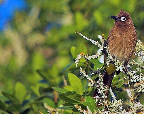 According to the Sasol Bird e-guide, the Cape bulbul is “usually seen in pairs or small groups. It is a conspicuous bird, which tends to sit at the top of a bush. They are active and noisy birds [that eat] fruit, nectar and insects.” Look out for the bright yellow undertail and the white ring around the eye.