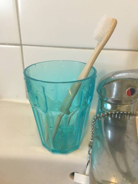 I have always closed the tap while brushing my teeth. Now I have also introduced a little blue glass that I fill halfway and then use this to rinse my toothbrush and my mouth. No more rinsing under a running tap.