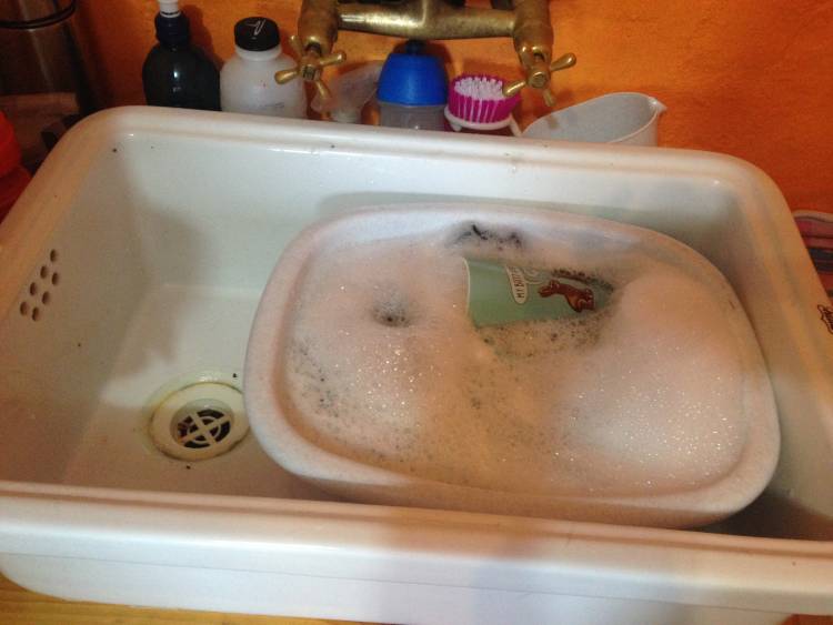My kitchen sink is beautiful and I really love it, but when I installed it, I did not take into account its size. It’s really too big for one person’s needs. So I have placed a smaller basin in the sink and I use that to do my dishes. After the dishes have been done and the water has cooled down, that water goes into the garden. I can do this because I use environmentally friendly cleaning products.