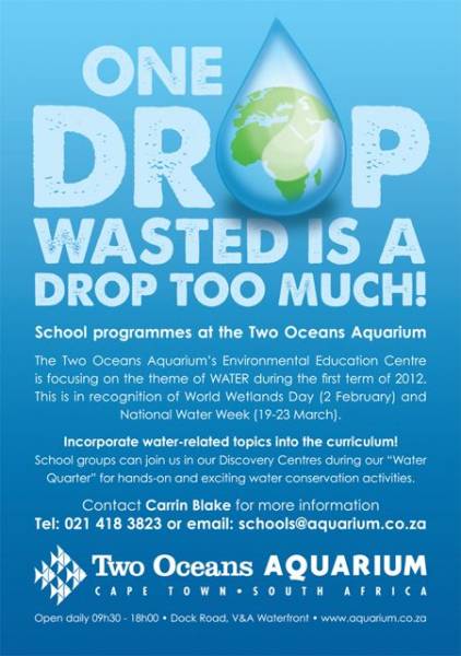 “We will produce water-specific resource packs for teachers who book a water conservation lesson at the Aquarium during February and March. The packs will include factsheets, books and a CD with information. Any school that visits us on World Wetlands Day or during National Water Week will receive a resource pack regardless of whether they’ve booked our water conservation lesson.”