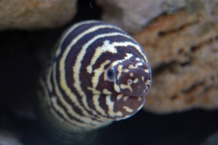 Zebra eels, like all eels, like hiding among the rocks a lot, so for him to poke out his head was a miracle and I managed to get this shot. Look out for him in the eel exhibit.