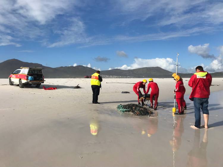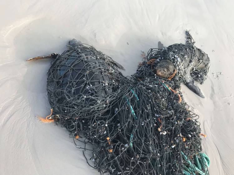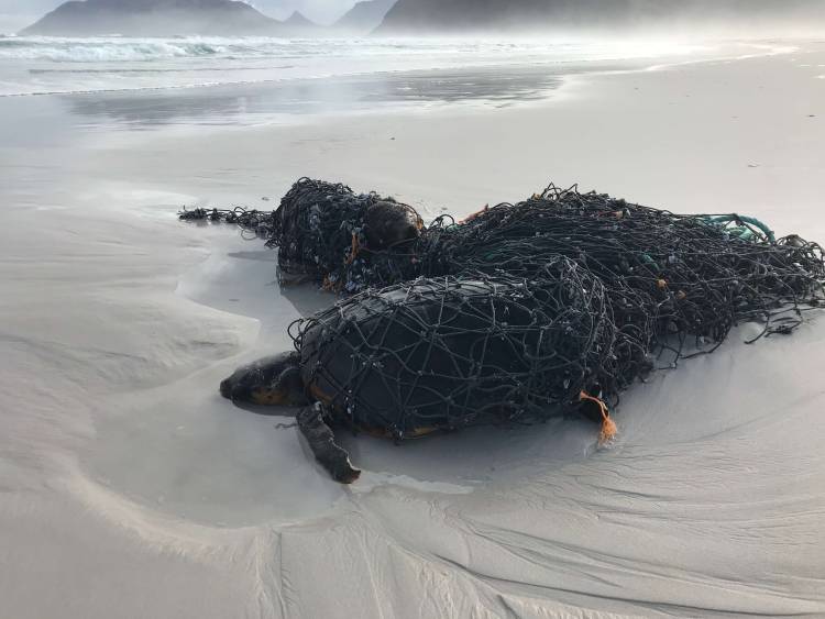 Yesterday afternoon (31 July), members of the public contacted the NSRI when they discovered a Cape fur seal and what they then thought was a dead loggerhead sea turtle tangled in an abandoned fishing net that had washed up on Noordhoek Beach, near the wreck of the Kakapo. The NSRI got in touch with the Two Oceans Aquarium for assistance and advice about freeing the entangled seal, and as luck would have it, our Curator Maryke Musson was nearby and able to step in to assist.