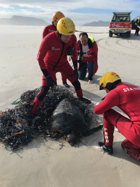 Both of these animals are incredibly lucky to be alive. Were it not for the mere chance that this net happened to wash up in a relatively short time, both animals would have drowned - in ideal conditions a calm seal can hold its breath for about 10 minutes, and a calm turtle up to 7 hours, but both these animals would have panicked, using their air much faster. Their survival odds were tiny and were it not for the stormy seas around Noordhoek, the net may not have washed up high enough or quickly enough for them to survive.