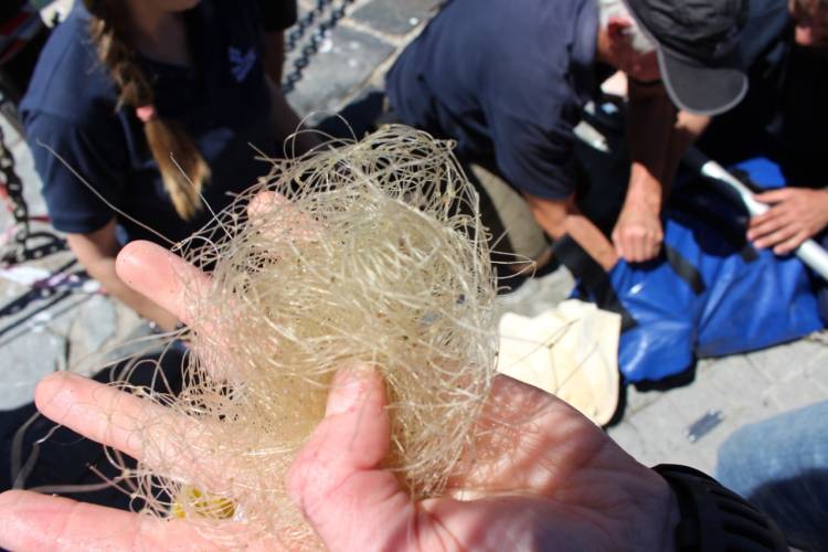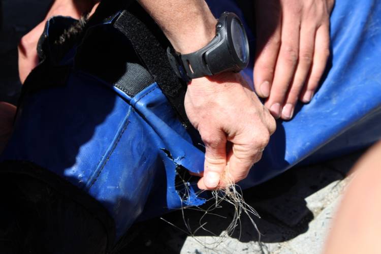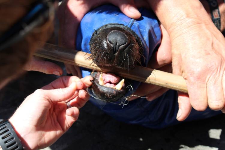 Remains of a gill net had ensnared the seal’s mouth and were wrapped around its jaw and inside its mouth. It took practiced attention to detail and gentle care to safely remove this painful netting.