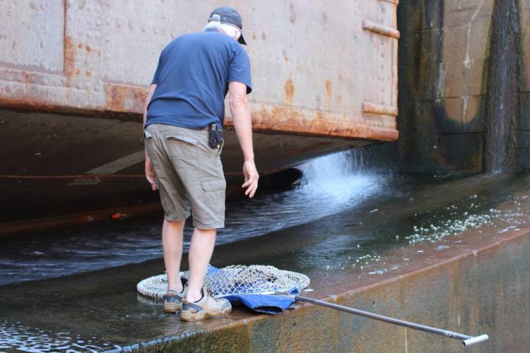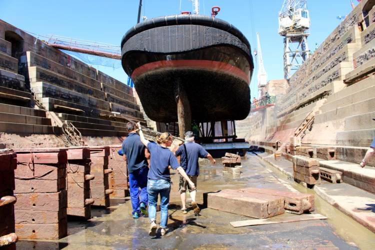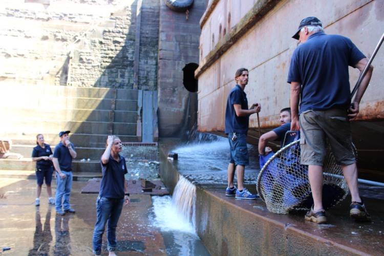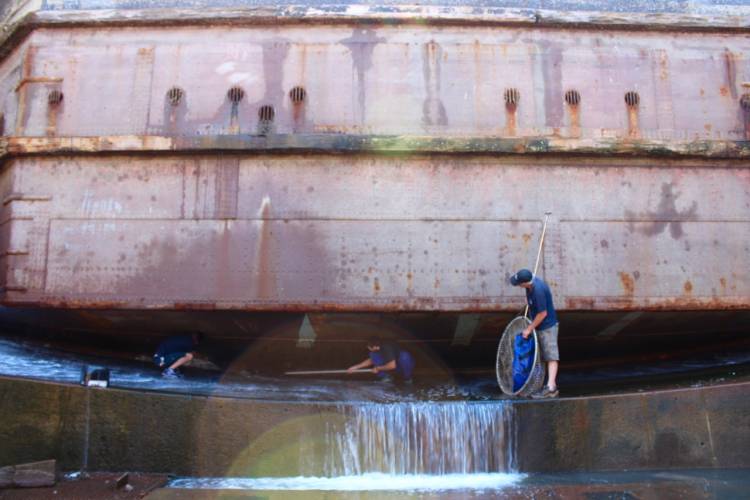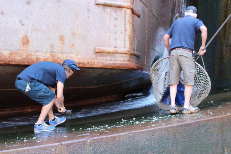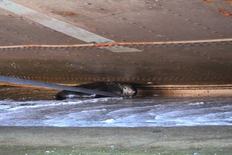 Then it was up and out of the dry dock, to the nearest jetty, where the seal could be disentangled and released.