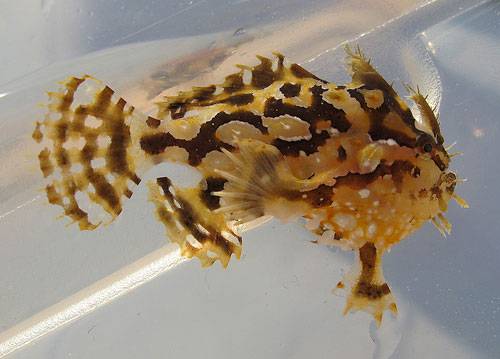 According to the Encyclopedia of Life, “The sargassum fish Histrio histrio is a member of the frogfish family, a group of small, globular fishes with stalked, grasping, limb-like pectoral fins with small gill openings behind the base, a trapdoor-like mouth high on the head, and a ‘fishing lure’ (formed by the first dorsal spine) on the snout.