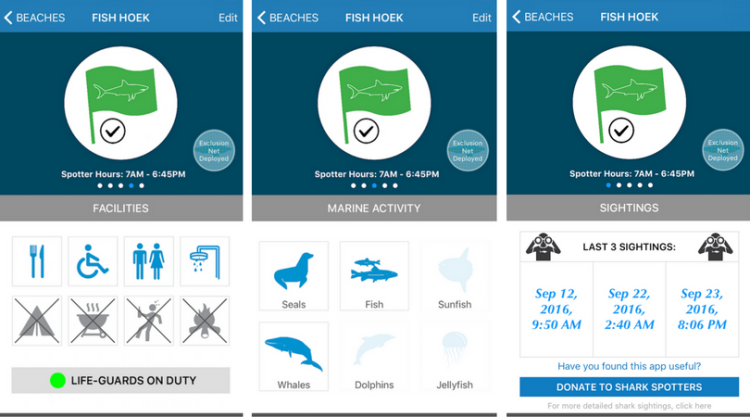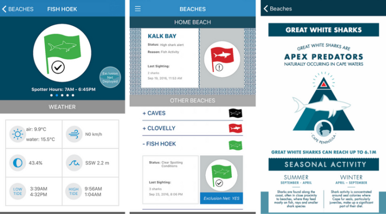The Shark Spotters app provides the most up-to-date shark safety information, live from their operating beaches, including which flag is flying and why (e.g. poor spotting conditions due to cloud cover), the latest shark sightings at that beach, water temperature and lunar phase, and whether the shark exclusion barrier at Fish Hoek has been deployed or not.