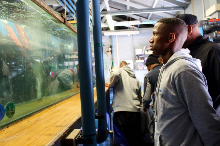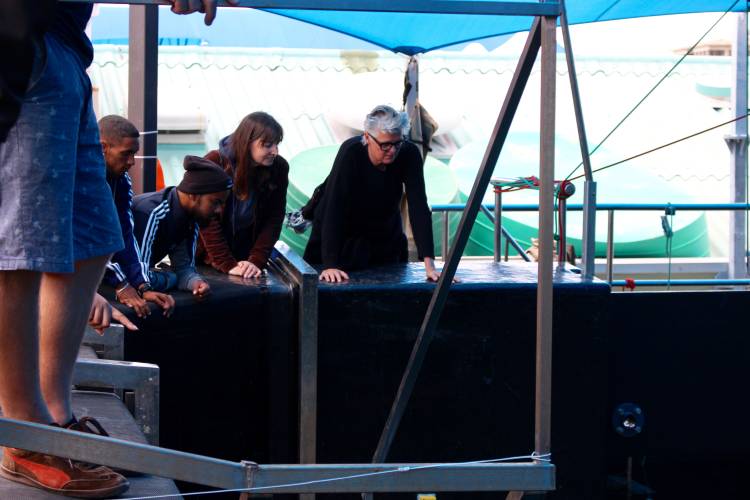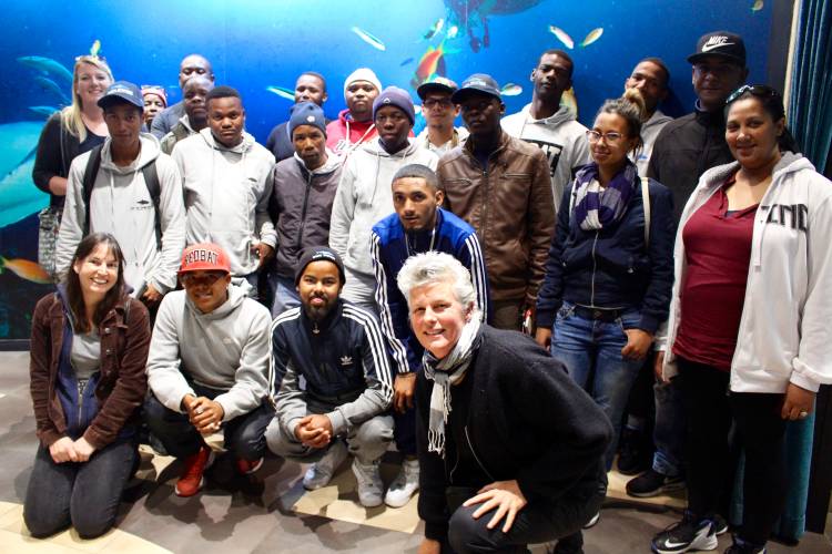 We at the Two Oceans Aquarium deeply admire the work done by these individuals and it was such a privilege, not only to be able to put up this homage at our ragged-tooth shark exhibit but also to welcome the Shark Spotters to the Aquarium for a special front-of-house and behind-the-scenes tour. Josie and Bronwen came along for the day and everyone got to see the ragged-tooth sharks … from the top!