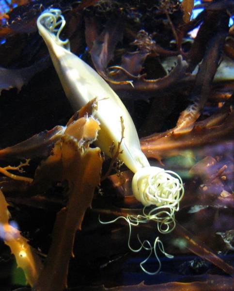 As you may know, shysharks lay their eggs in clusters of seaweed. Long coiled tendrils, which extend from the corners of the rectangular egg cases (giving them the name “mermaid’s purses”), get caught in the seaweed and hold the eggs in place for the seven months or more that they need before they can hatch.